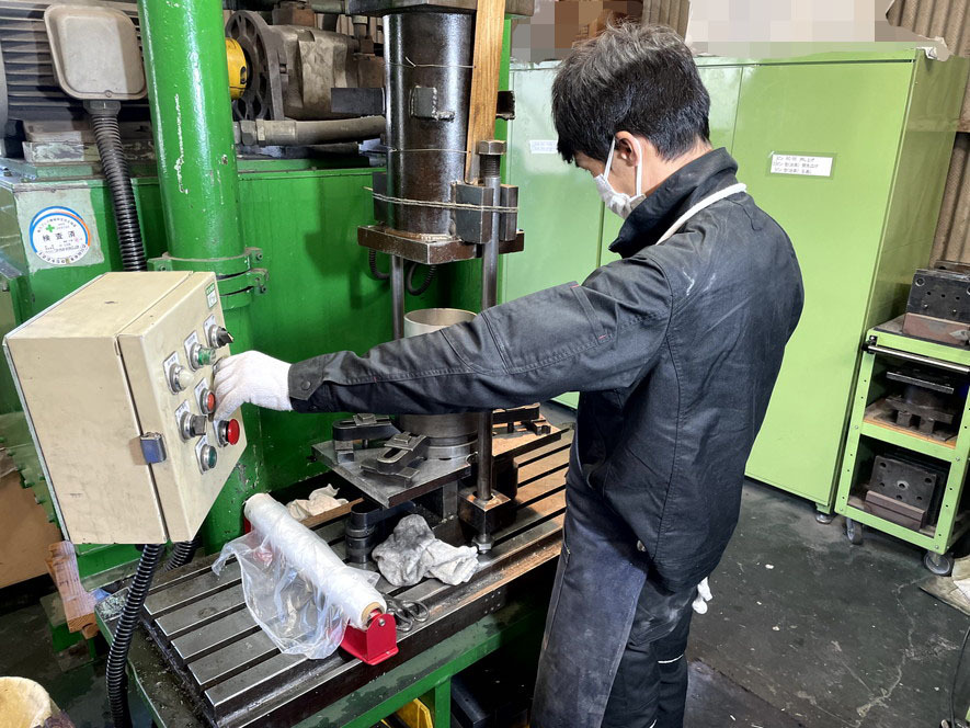 私は製造部門に所属しており、仕事は、アルミ配管継手製品の製造全般と出荷業務に携わっています。会社では社員に幅広いスキルを身に着けてもらうため、多能工化を進めています。私も入社当時より、製造業務における様々な工程を担当させてもらい経験を積み上げてきました。 継手製品の製造には材料の切断から、成形、キズ取り、熱処理、仕上げ切削、表面仕上げ等、完成まで様々な工程がありますが、仕事の状況に応じて、切断の仕事を担当したり、成形の担当をしたりと、製造の全ての工程に関わっています。