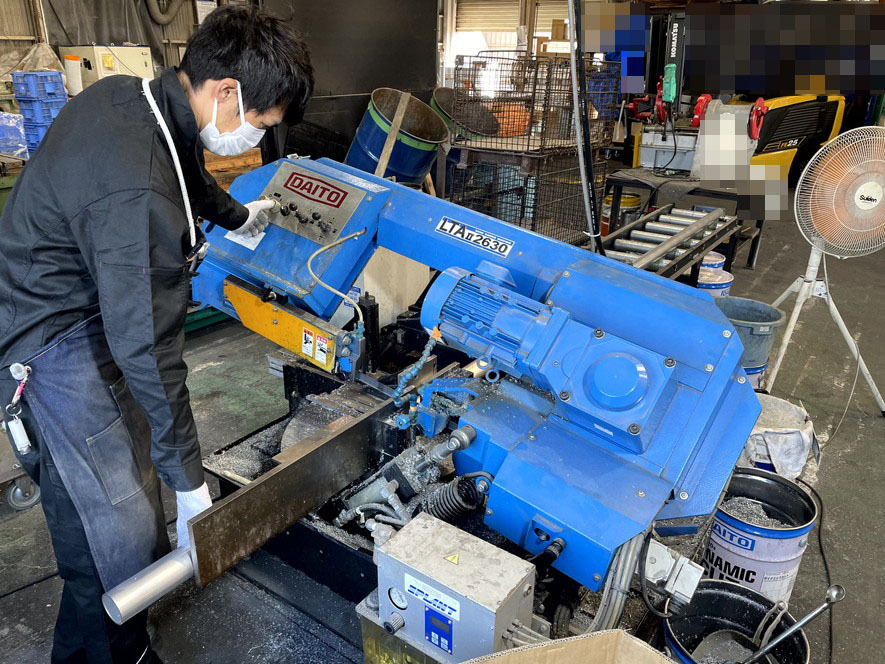 製造担当の社員は、朝のミーティング終了後、各製造工程に分かれて作業を行います。写真は切断工程の様子です。バンドソーと呼ばれる機械で、パイプや丸棒の切断を行います。毎日、切断パイプの注文があるため、午前中は出荷用のパイプの切断がメインとなることがあります。その他、継手の材料切断を行います。継手の種類によってパイプを切断したり、アルミの丸棒を切断したりします。
