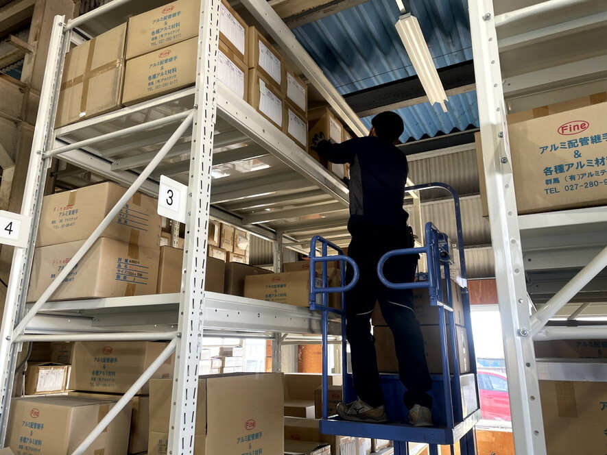 アルミ継手の他にも、アルミパイプや、棒、板、型材等のアルミ材料販売の他、アルミ加工品の製造販売も行っているため、毎日、様々なアルミ製品の出荷があり、全国のお客様へ商品を発送しています。 午前中までにいただいた注文で在庫のあるものは当日出荷をしています。