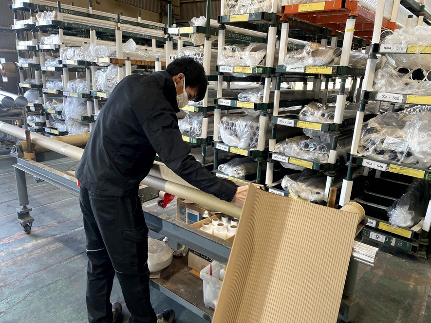 パイプや棒等、長尺品の出荷も毎日あります。顧客の要望の長さに切断を行います。バンドソーという切断機で切断し、これを段ボールで梱包して全国の顧客に発送します。