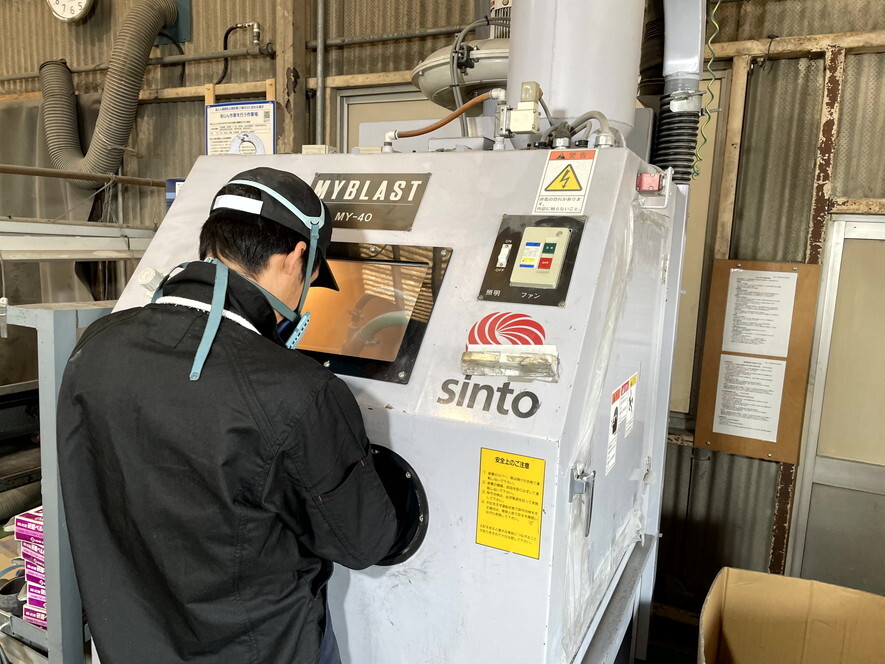 アルミは鉄に比べて強度が弱く、傷もつきやすいことから、ショットブラスト工程では、製造時についた加工キズや取り扱いキズを取るために、製品表面にガラスビーズを吹き付けて、梨地状に表面を加工します。この加工により、細かな加工キズは消え、光沢のある表面に仕上がります。