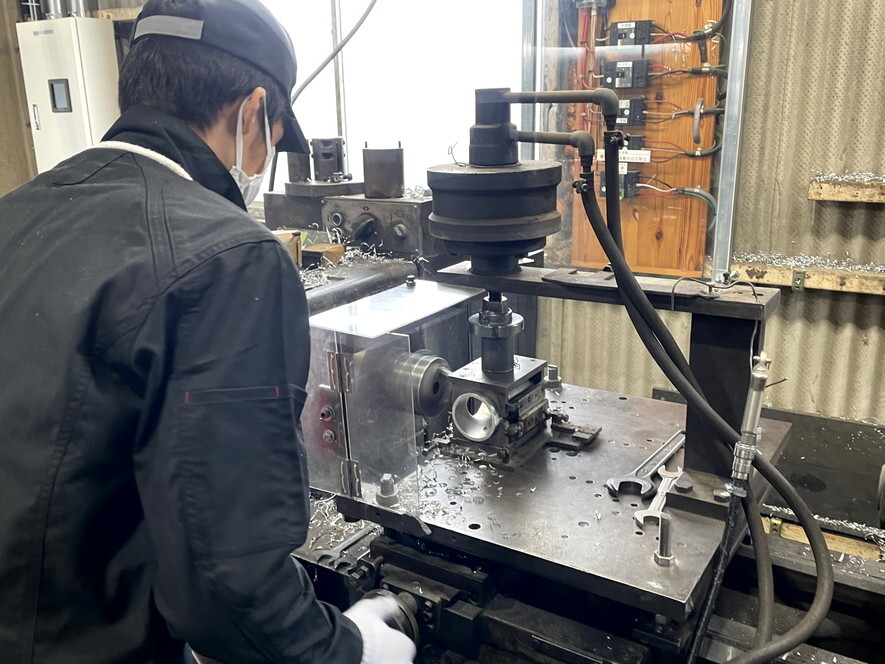私の製造するアルミ配管継手は、船舶やタンクローリーや消防車などの特装車両、ガスや冷却装置などの低温配管等、国内の重要なインフラに使用されていることから、いずれの工程を担当しても、不良品を出さないことを第一に考え作業を行っています。また、機械のトラブル等が起きた際にも社員同士で情報共有して、製品への不具合が起きないように日々心掛けています。